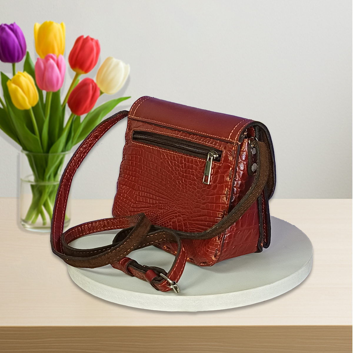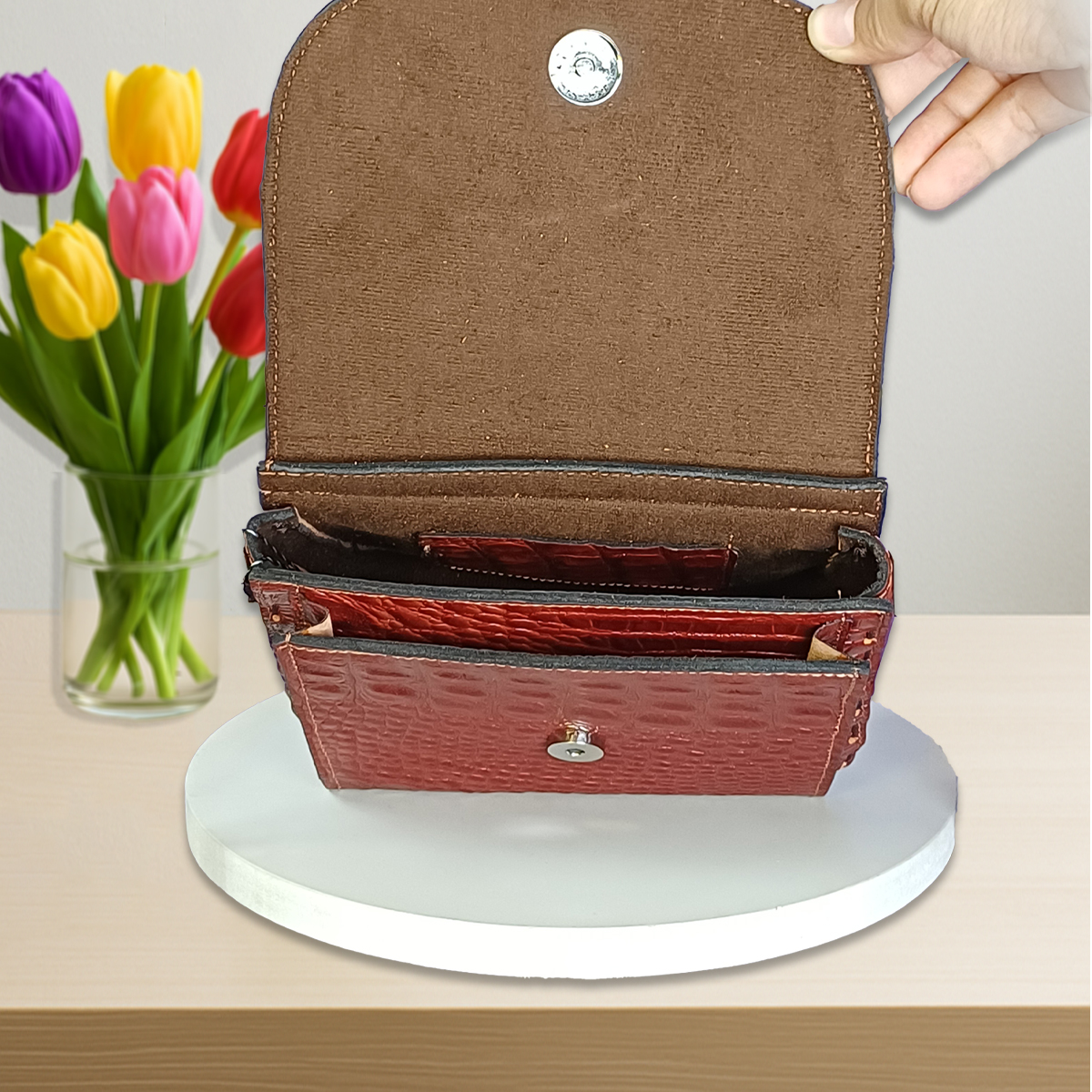 این کیف چرمی زنانه از چرم طبیعی گاو تهیه شده و با دستان هنرمندان تیم فروشگاه اینترنتی خورشید دوخته شده است.